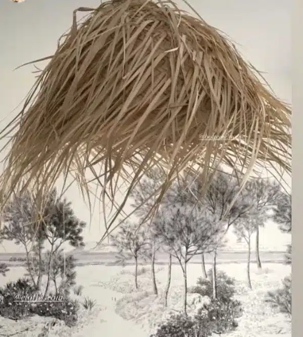 Cette suspension est tressée à la main par notre artisan en feuille de palmier.