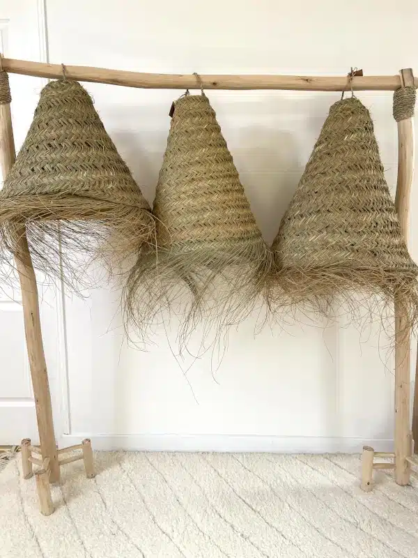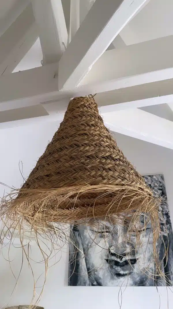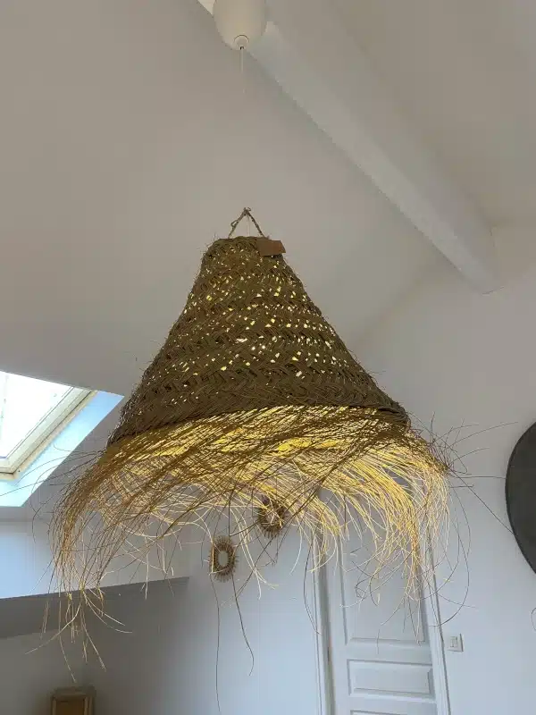 Cette suspension est tressée à la main par notre artisan en fil de palmier.